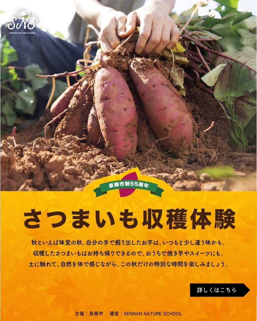 せんなん自然学校 (Sennan Nature School) のさつまいも収穫体験! 初めての方大歓迎!街なかでさつまいもを収穫しよう! 土の中から自分の手でさつまいもを掘り出してみませんか? 自分で収穫したさつまいもの味は格別…