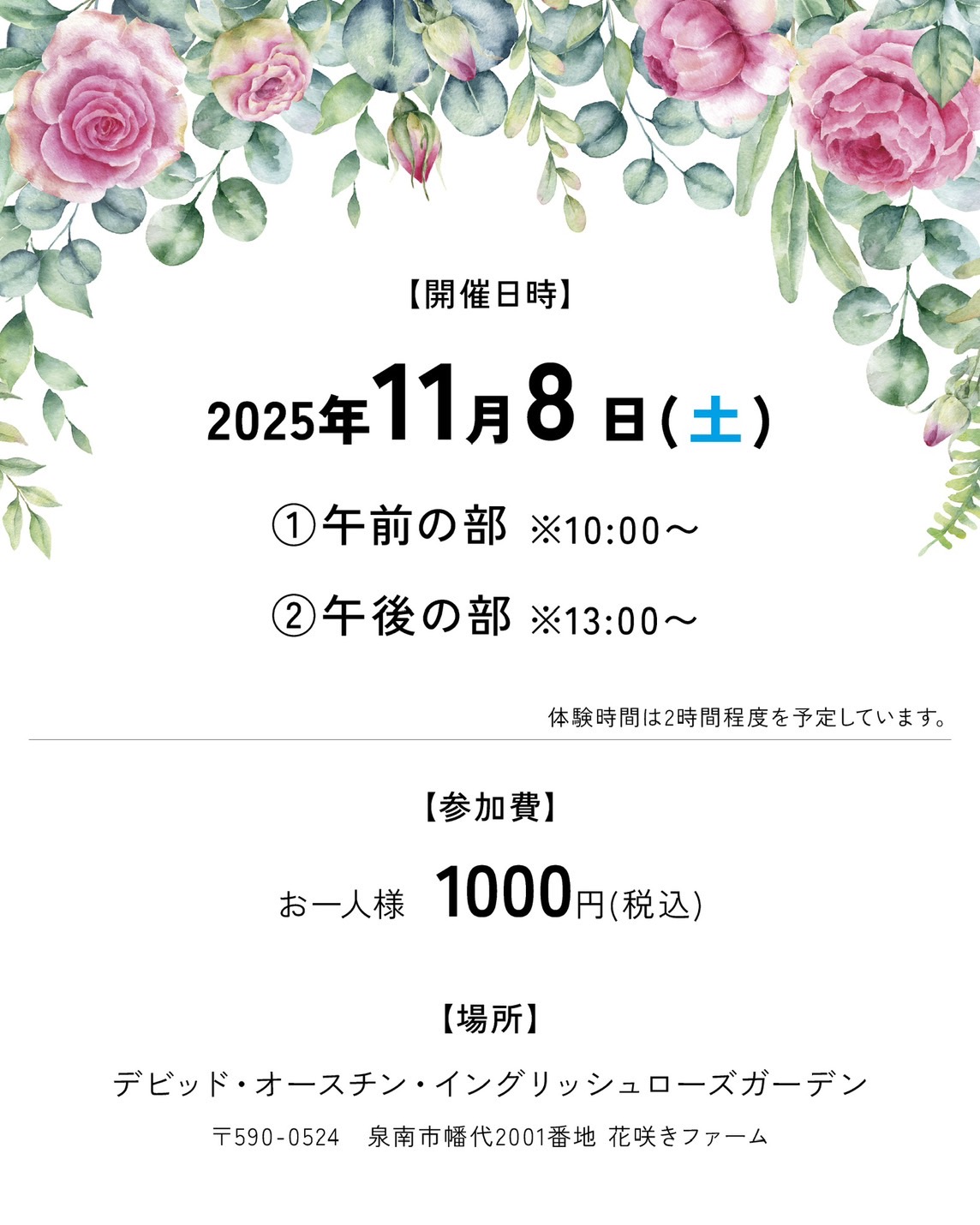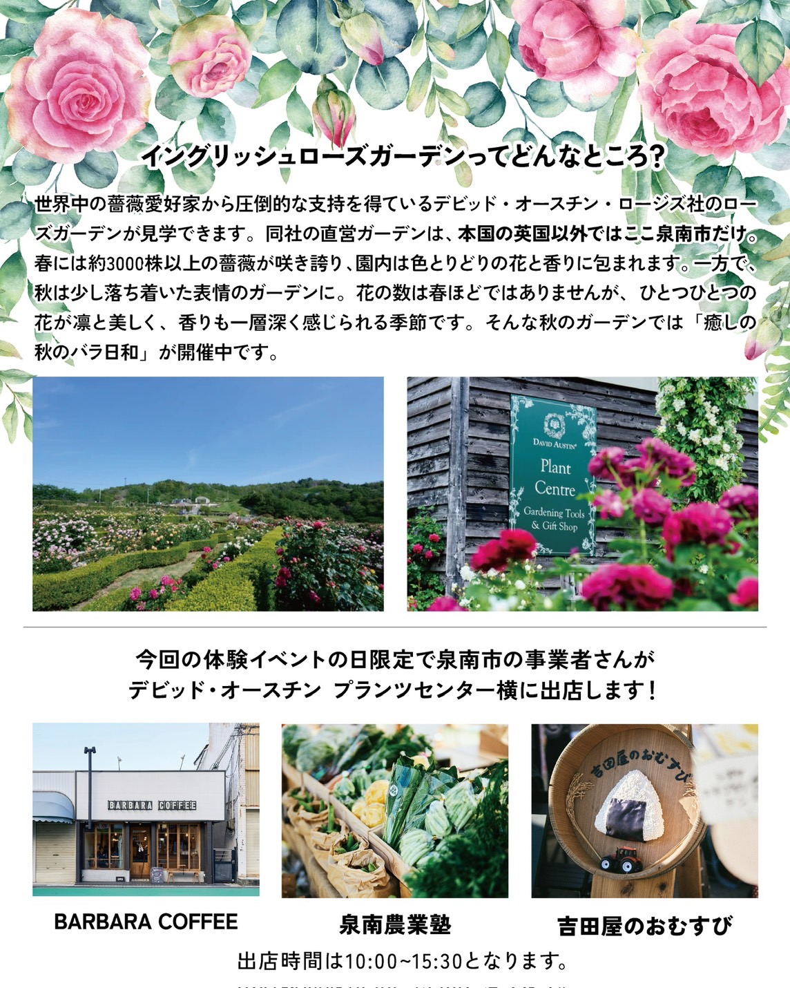 また当日限定で泉南市の事業者さんがローズガーデンに出店!芸術の秋に食欲の秋も一緒に楽しめます。