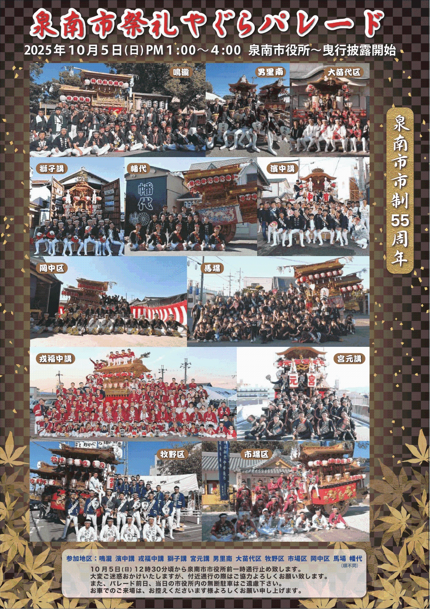 10月5日(日)午後1時から、泉南市役所前にてお披露目曳行がとりおこなわれます。