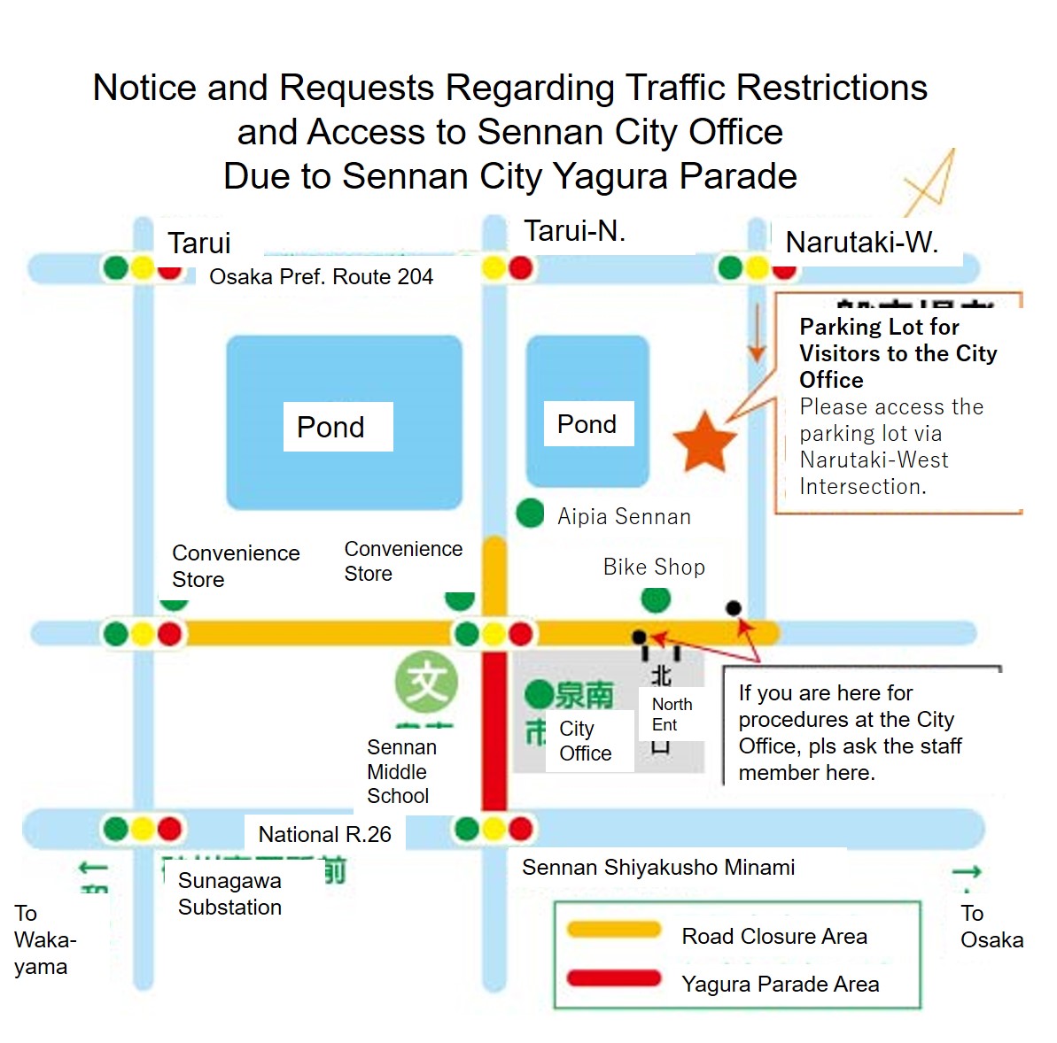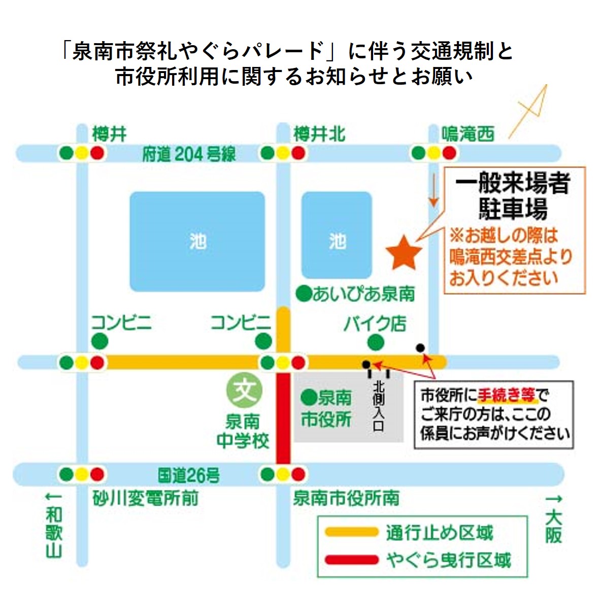 (注意)一般来場者のみなさまは、泉南市役所や近隣店舗への駐車は絶対にしないでください。