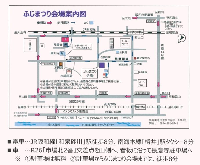 ※ふじまつり会場は、「熊野街道」沿いにあります。昔ながらの街道筋ですので、近くには来場者用の駐車場はありません(但し、身障者の方用として5台分のみ用意されています。上記藤保存会問合せ電話番号までお問合せください)。