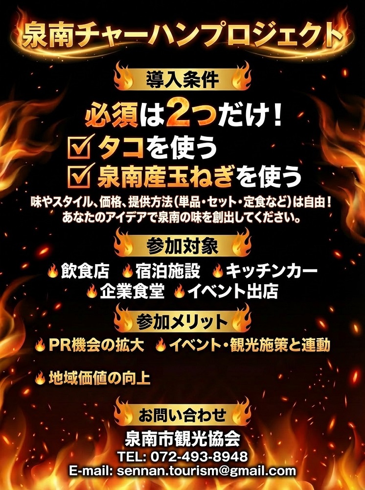 泉南市観光協会では、地域食材の魅力発信と観光誘客、飲食関連事業者の皆さまの活性化を目的に、「泉南チャーハンプロジェクト」をスタートします。